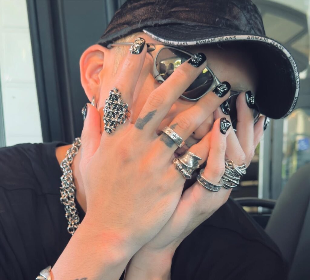 His ring selections also complement the gritty visuals of his music videos and concept shoots, strengthening his visual identity as an experimental artist.